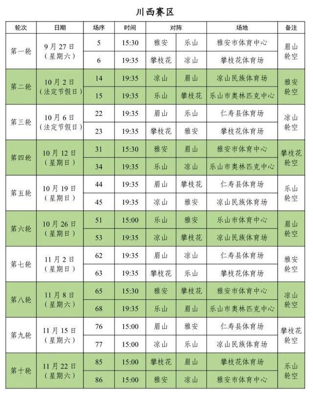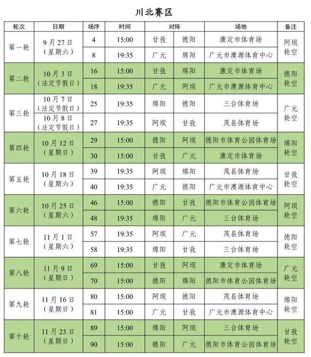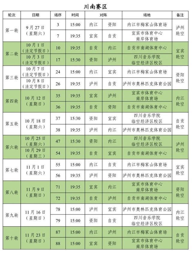 9月20日川东赛区首先开战,19时35分,成都队将在主场双流体育中心迎战遂宁队,这也是当周唯一一场比赛,届时全川乃至全国球迷的目光将聚焦成都。